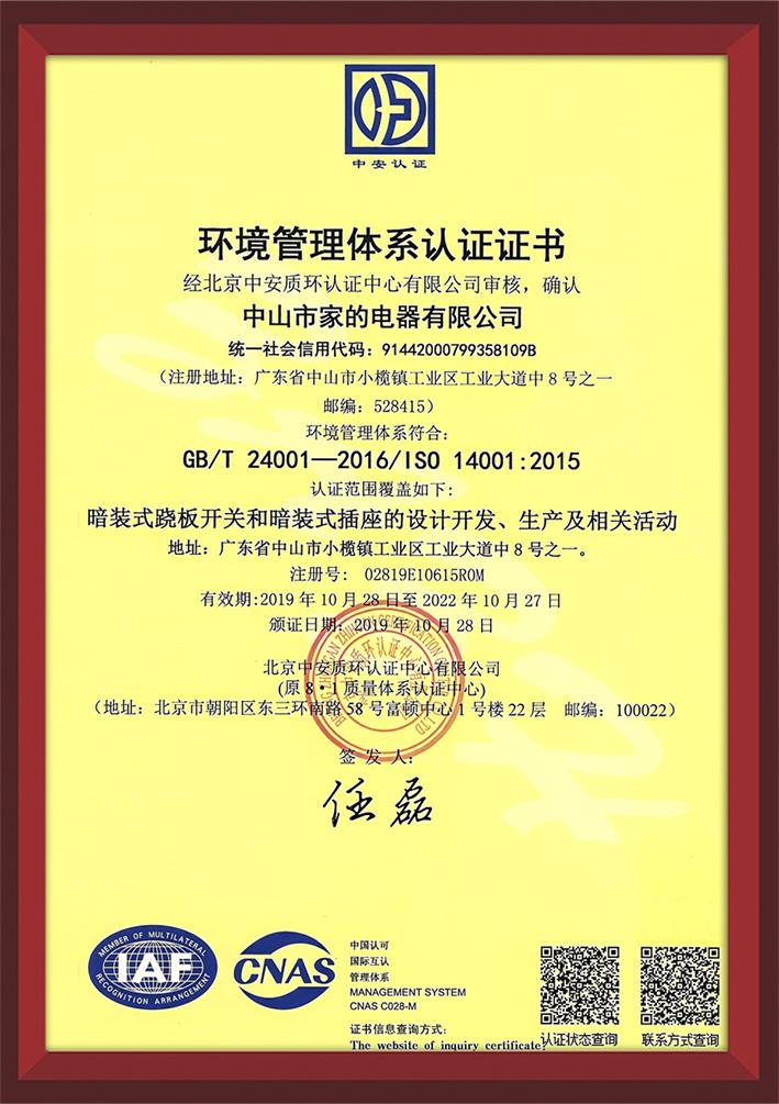 經(jīng)北京中安質環(huán)認證中心有限公司審核,2019年第四季度,中山市家的電器有限公司通過“環(huán)境管理體系認證”,并取得證書!