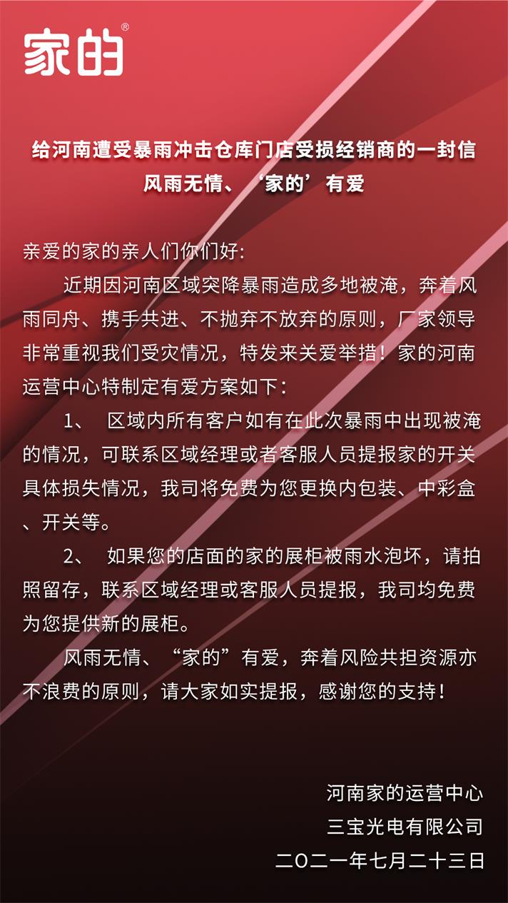 河南出現水災,家的區域經理、客服人員及時聯系當地終端客戶,了解受災情況。廠商攜手共進,共同解決問題。針對河南當地因雨水浸泡,造成損失的家的終端客戶,家的公司將作出相應的關愛措施。比如,免費更換內包裝、中彩盒,開關等。家的為受災的家的實體店恢復經營提供支援,減輕受災客戶的壓力。