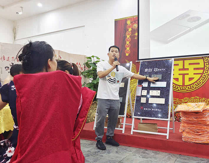 首先,由家的惠州、河源、梅州區(qū)域經(jīng)理——黃堯濤發(fā)表講話。他為大家詳細地介紹家的新品——第3代復(fù)位大板開關(guān)、一體式防水插座。