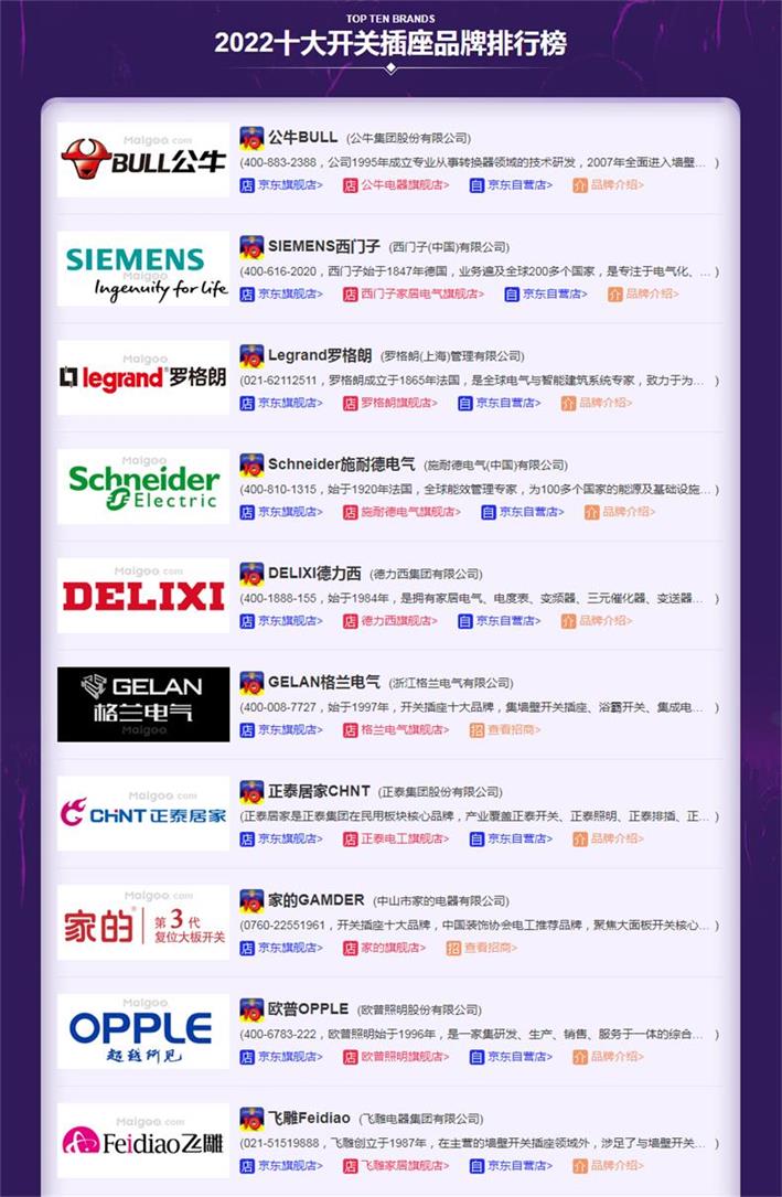 2022年開關(guān)插座行業(yè)十大品牌:公牛、西門子、羅格朗、施耐德、正泰、德力西、家的、歐普、飛雕、格蘭。(排序不分先后)