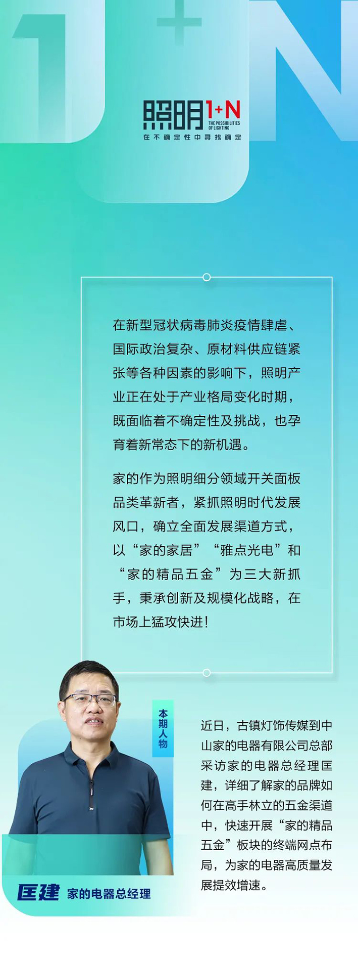 “五金渠道是注重平臺性的發展,是集中高效的拓展和高效的動銷。與專業渠道不一樣是五金渠道注重的是效率。今日的競爭實際上是效率的競爭。未來,家的將在互聯網后終端時代,實現新零售線上線下一體化。”匡建對于家的未來發展滿懷信心,在不經意間溢于言表。(文章來源于古鎮燈飾傳媒)