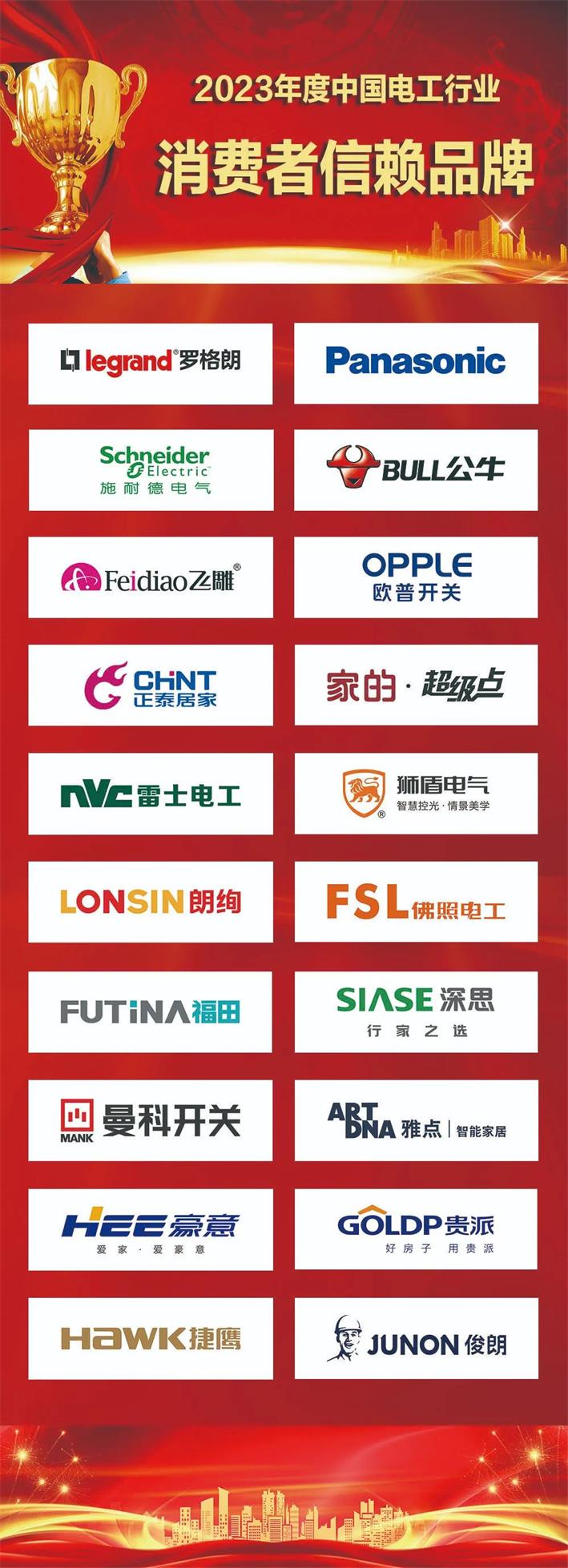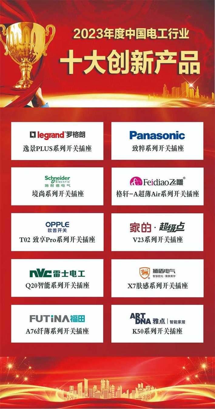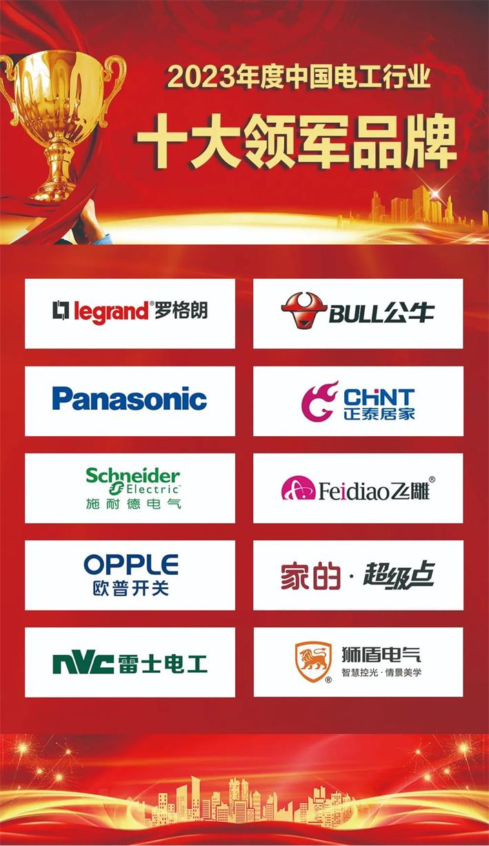 家的3大榮譽分別是:2023年度中國電工行業“十大領軍品牌”、“消費者信賴品牌”、“十大創新產品”